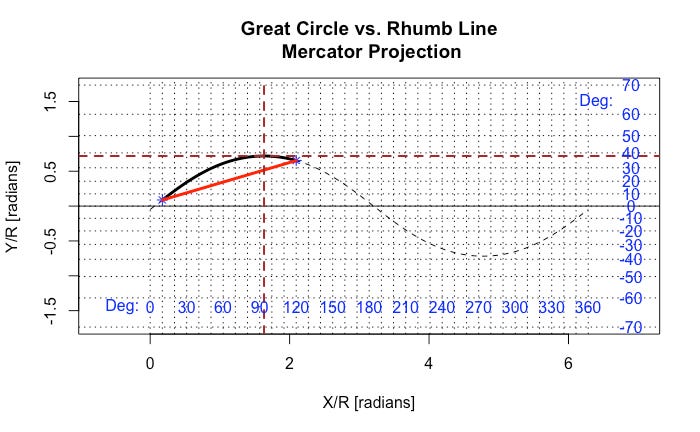 A glance at the Mercator projection of a sphere can lead one to believe that the rhumb line is of shorter distance than the Great Circle path. However, this is a distortion created by the expansion of the latitude coordinates on the map. The Great Circle is the shorter route; in fact, the shortest route. In our last example, the rhumb line distance (assuming the sphere in question is the Earth, of radius 𝑅 = 3963 miles) is 7344 miles, while the Great Circle distance is 7141 miles – a savings of 203 miles.4