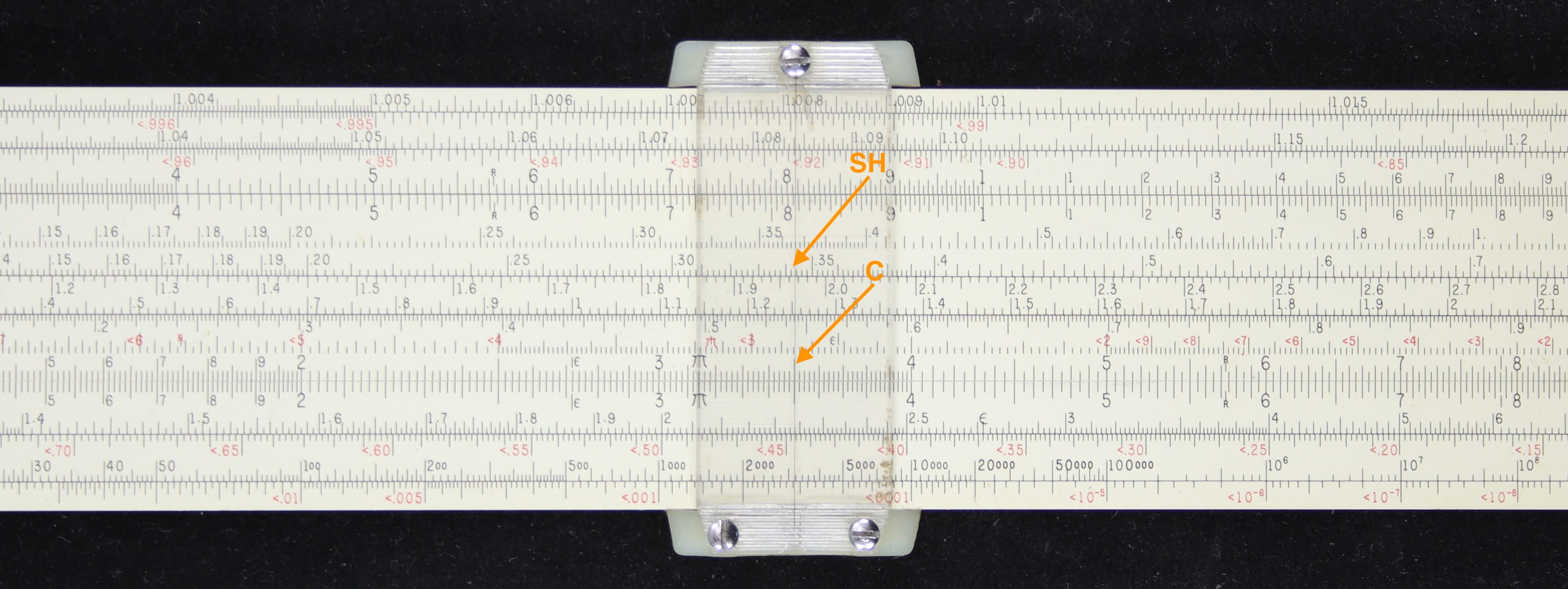 Next, either with the cursor at 0.350 on D and resetting the slide without moving the cursor, or by moving the cursor to find 0.350 on the C scale, we can read off of the SH scale the value of Y/R: 0.342. In other words, sinh(0.342) = 0.350.