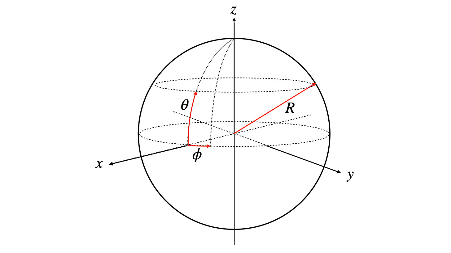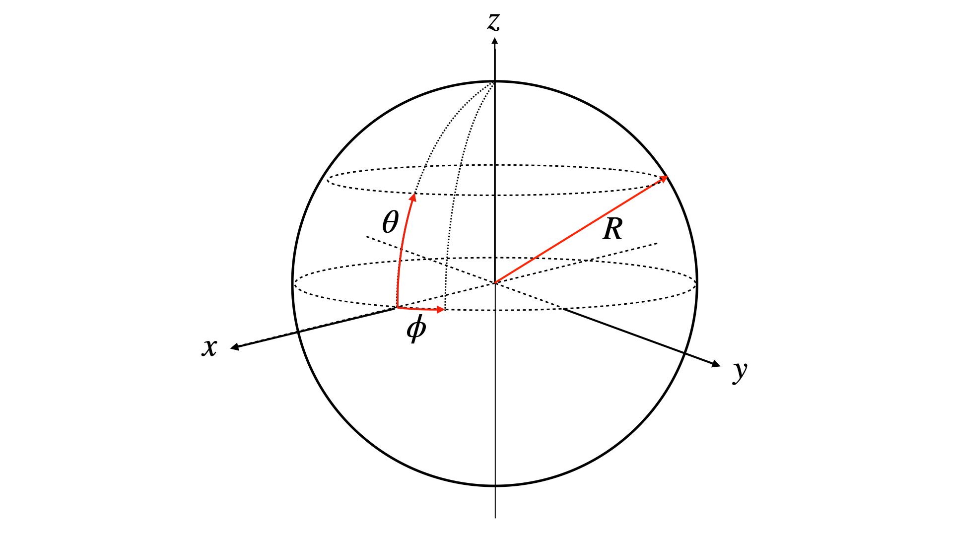 Any point in space located a distance r from an origin can be specified in terms of “spherical coordinates”. When the points of interest are those confined to the surface of a sphere of radius 𝑟 = 𝑅 = 𝑐𝑜𝑛𝑠𝑡𝑎𝑛𝑡, and specified in terms of longitude 𝜙 along the equator, and latitude 𝜃 measured perpendicular to the equator, then