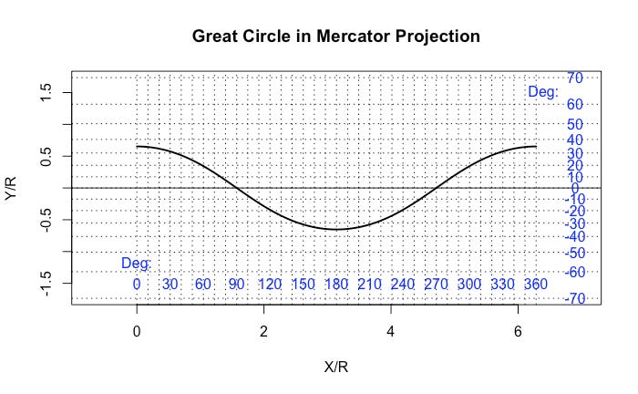 We can imagine a navigator having a Mercator map onboard the vessel from which rhumb lines are computed. But how would one illustrate a Great Circle on such a map projection? We saw in an earlier post that the coordinates on the Mercator Map, which today we will call (𝑋,𝑌), are related to the latitude and longitude on the globe, (𝜃,𝜙), through