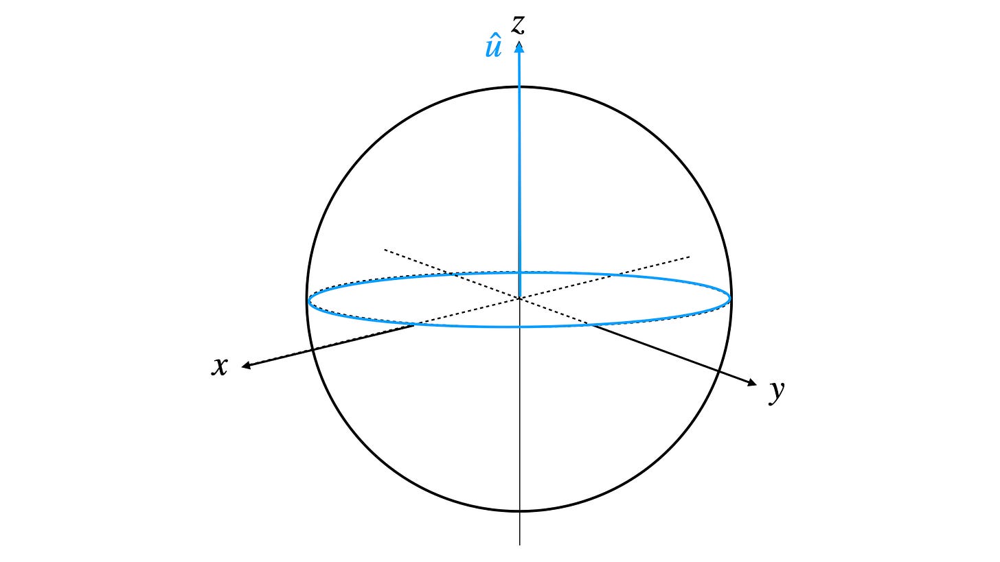 Our goal here is to find the equation of an arbitrary Great Circle on the sphere. This would be a circle on the surface whose circumference is 2𝜋R, which is the largest possible circle that can be drawn on the surface. The center of such a circle is always at the center of the sphere. One specific Great Circle that we can all agree on is the equator. Let’s define a unit vector that is perpendicular to the plane that contains the equator — it is in the direction 𝑢̂ = (𝑢𝑥,𝑢𝑦,𝑢𝑧) = (0,0,1).