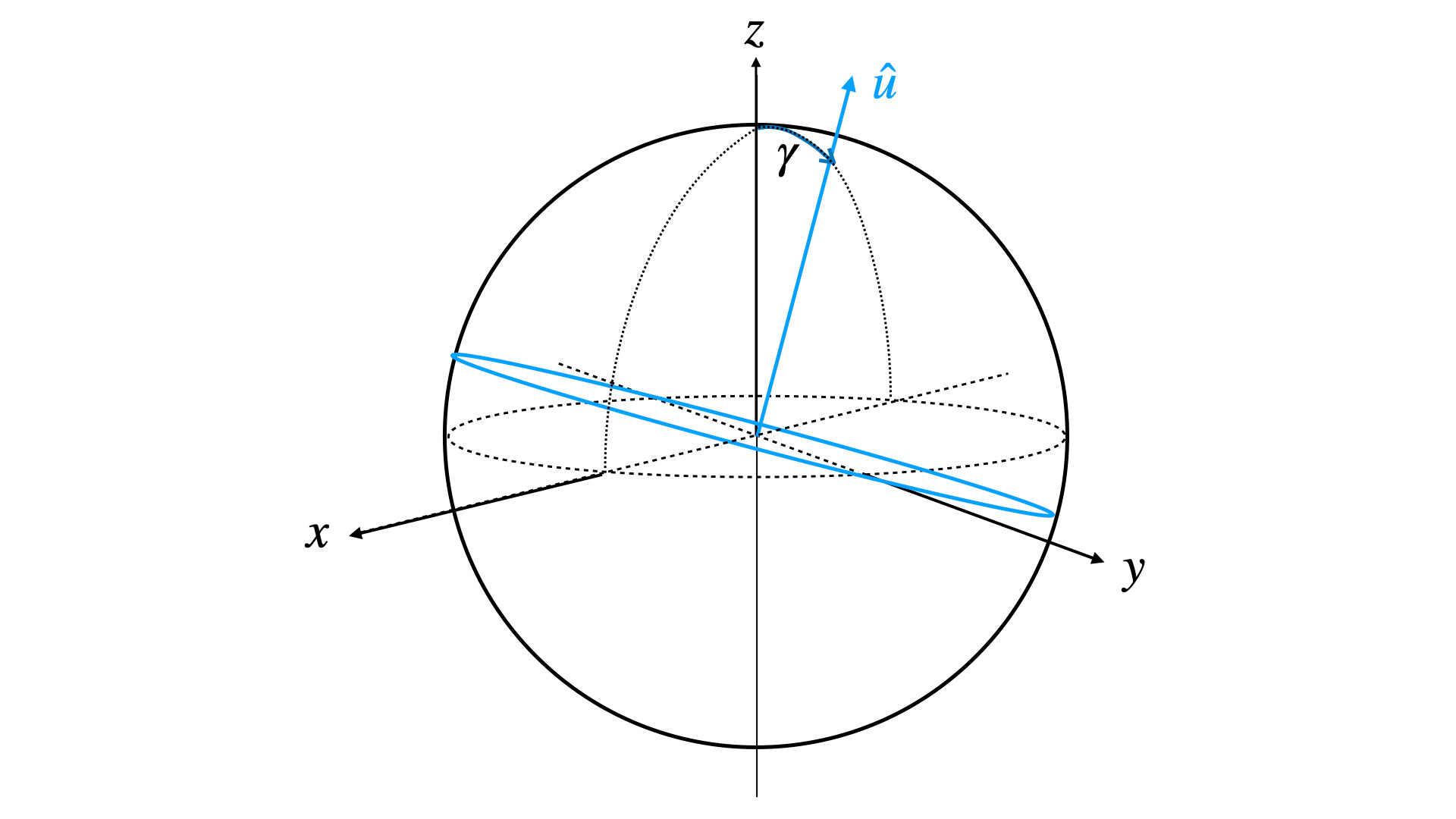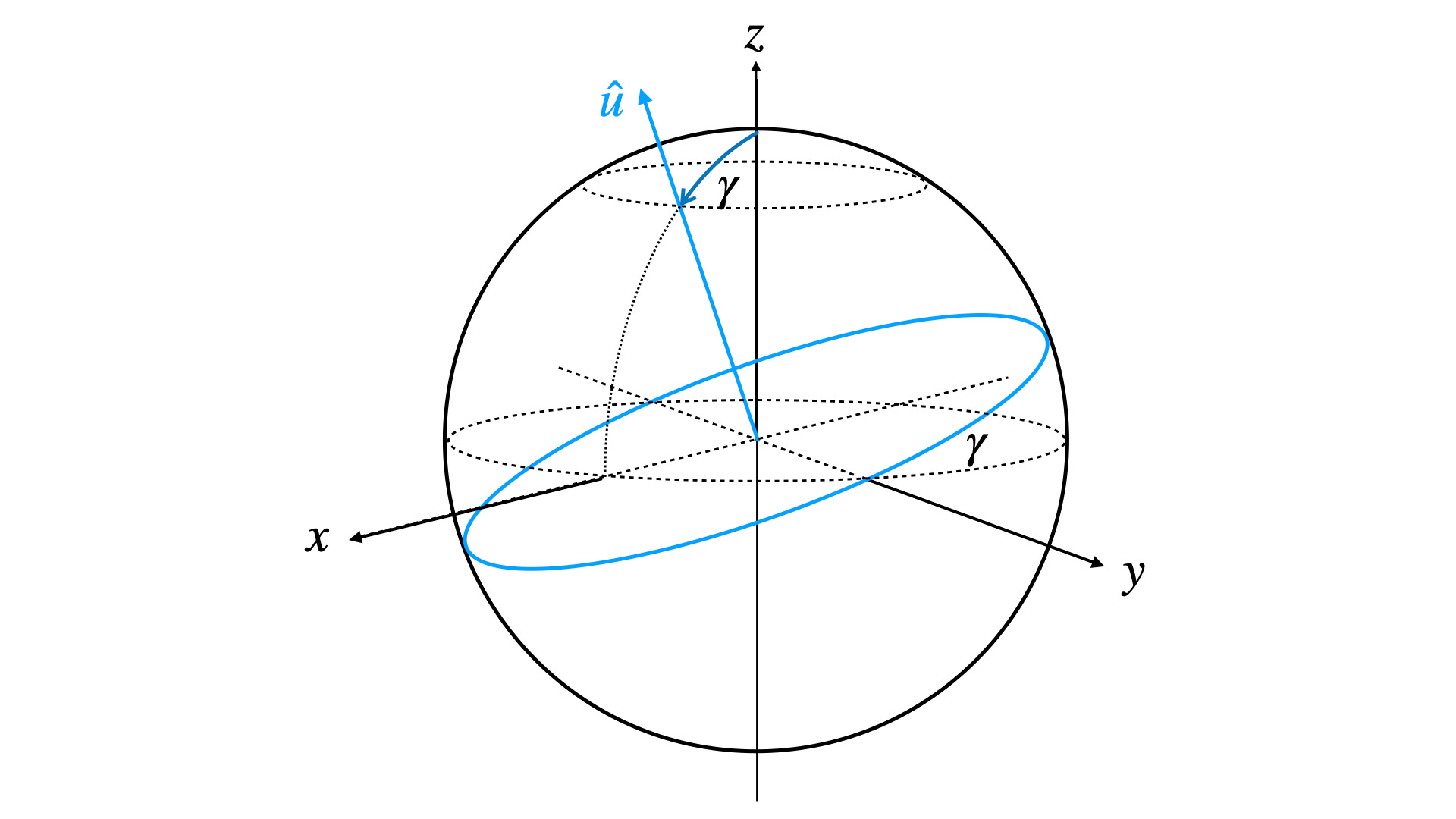 Next, suppose we rotate this circle by an angle 𝛾 about the 𝑦-axis, which, of course, maintains the size of the circle on the sphere. This amounts to rotating the unit vector 𝑢̂ away from the 𝑧-axis toward the 𝑥-axis, as shown below.